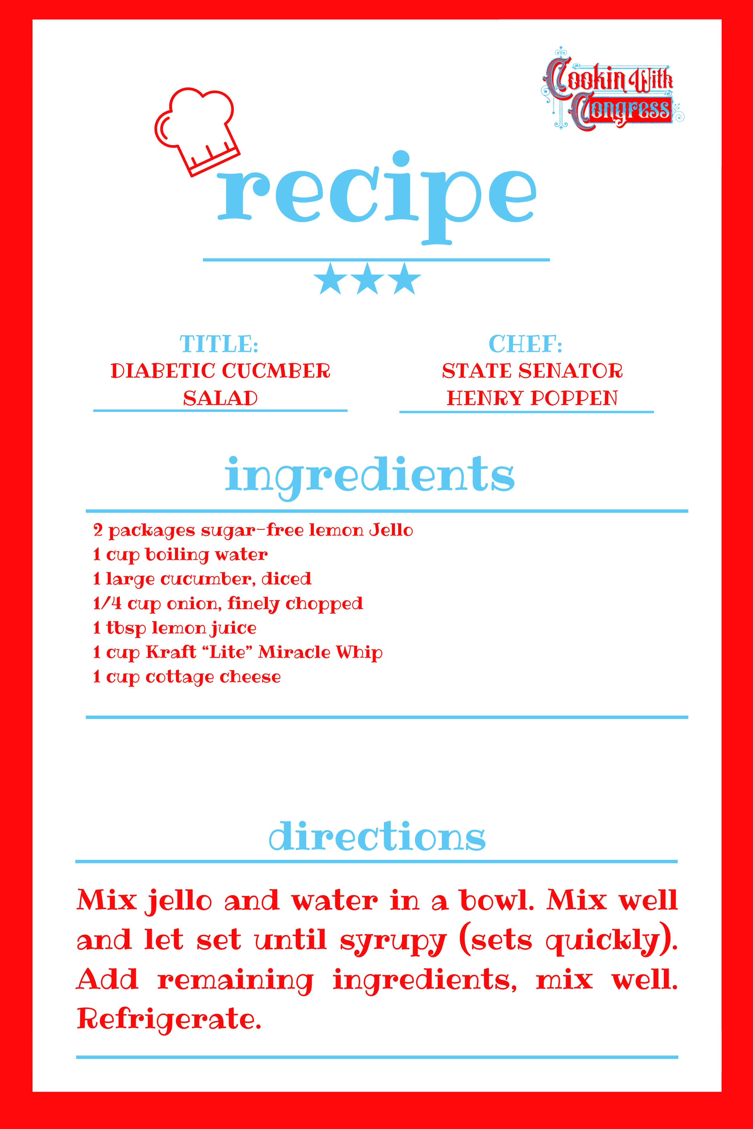 "Diabetic Cucumber Salad" by State Senator Henry Poppen