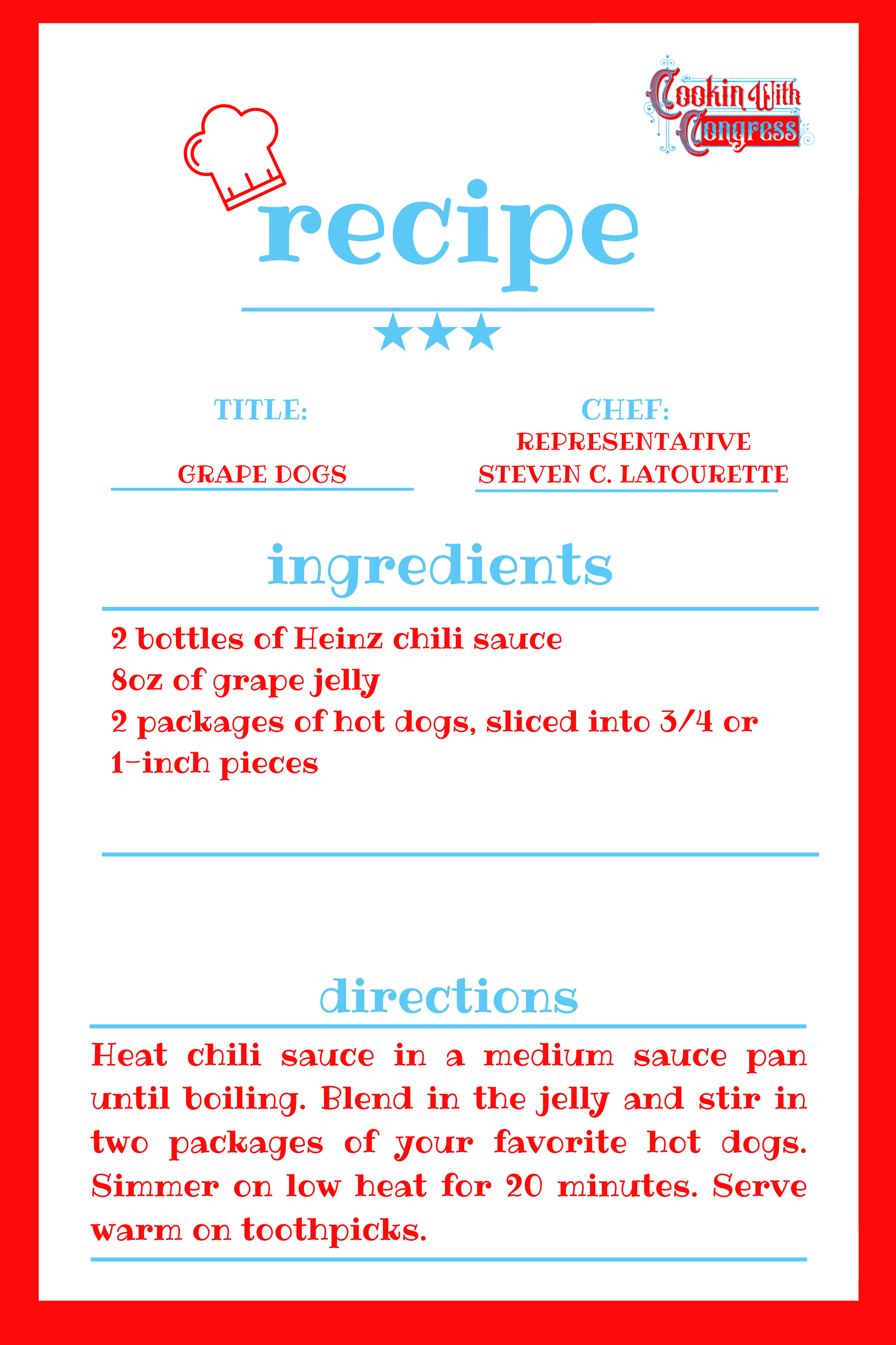Get ready to free up your day, because this meal only takes 22 minutes to make, and 20 of those minutes are just letting it boil on the stovetop. Delightfully simple, delightfully named — Representative Steven C. LaTourette’s Grape Dogs.