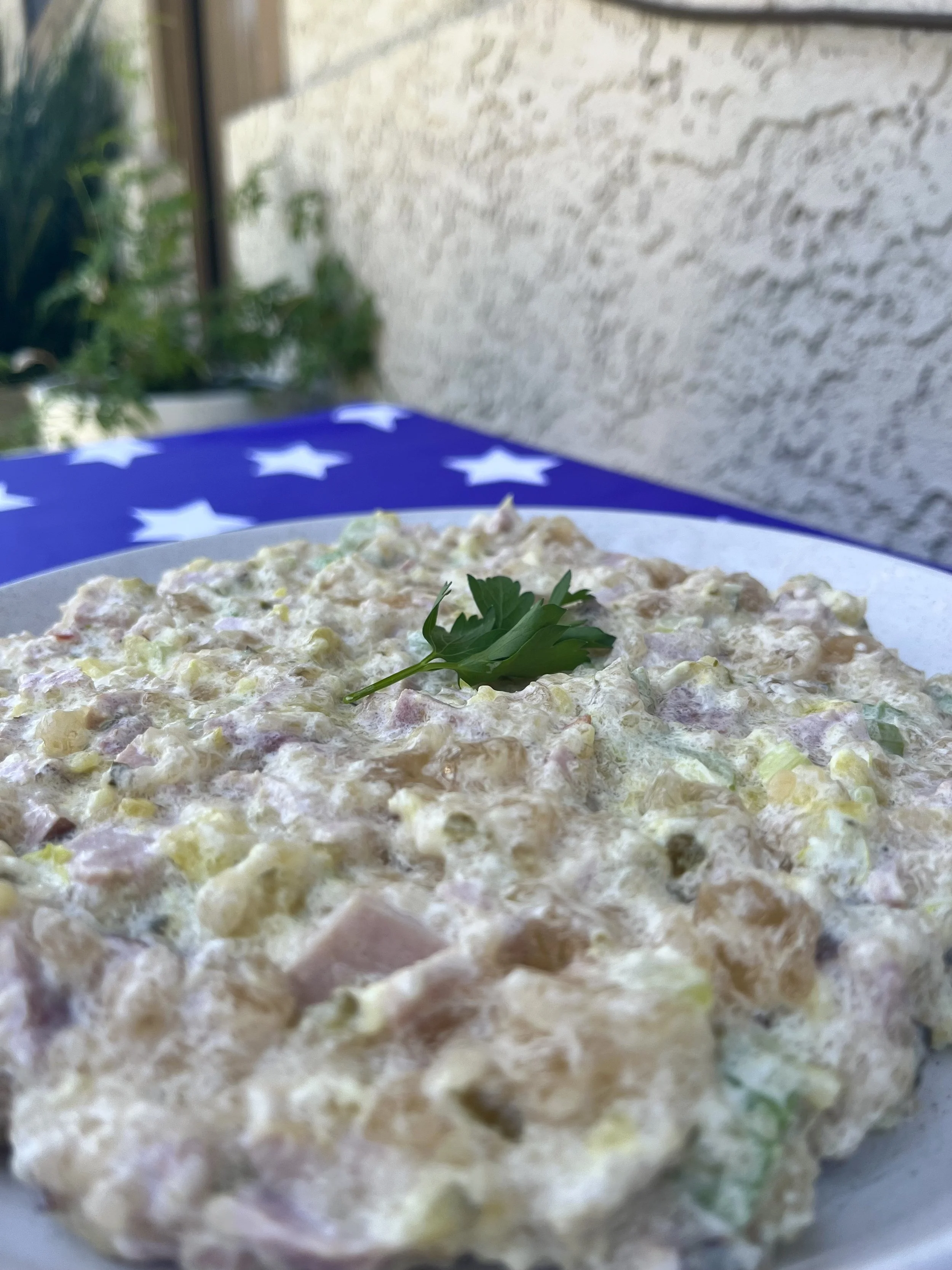 Voila! If you want to actually watch me attempt to eat it, go to the CwC Instagram or TikTok. This did not set nearly as well as I expected, but it also wasn’t a molded salad like our other friends we’ve made on here. This is…potentially the least attractive dish I’ve made. Perhaps ever. There is a certain bounce to it thanks to the jello, and scent-wise, raw onion and ham overpower pretty much everything else. Oh, and mayo. Fragrant mayo.