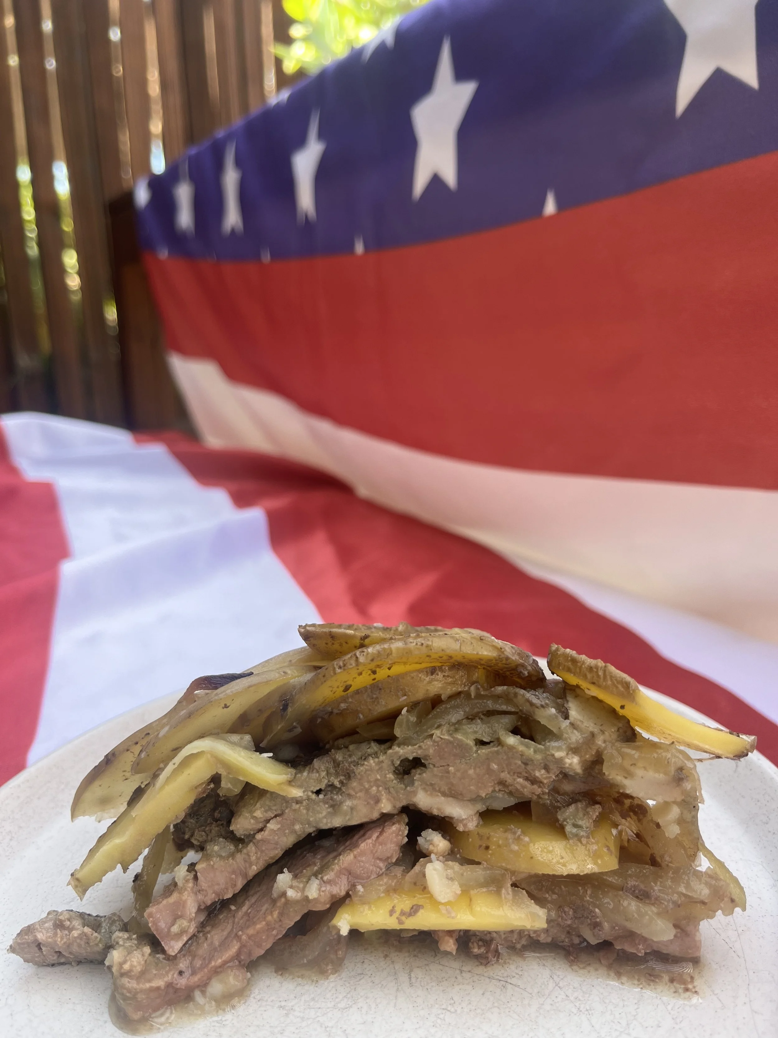 1) Cut the meat into slices 1/2 inch thick. Slice onions and potatoes 1/4 inch thick.