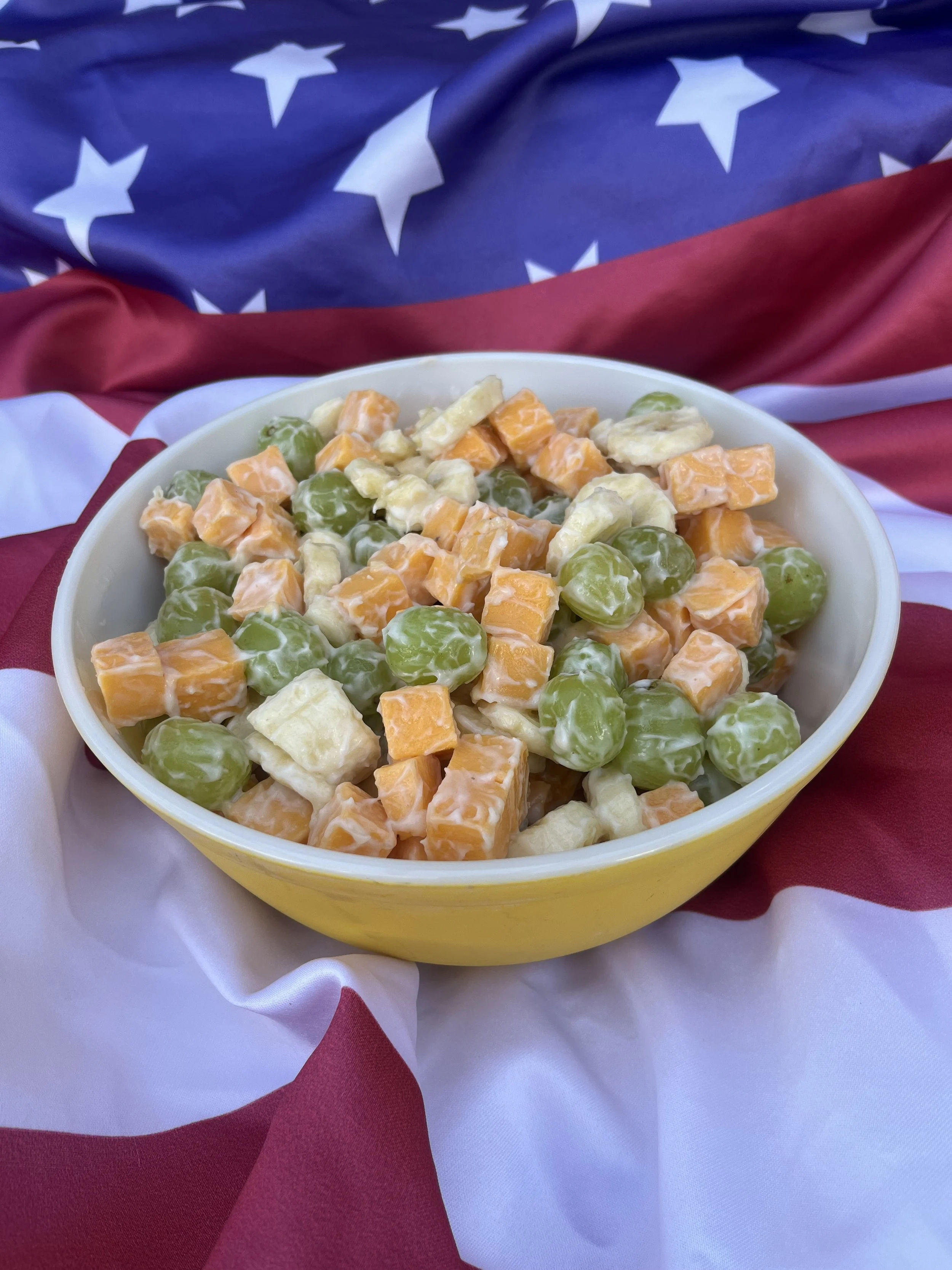 Voila! If you want to actually watch me attempt to eat it, go to the Cookin’ with Congress Instagram or TikTok and now, YouTube Shorts. Sometimes, a photo just tells you exactly what you’re looking at — it’s grapes, it’s bananas, it’s cheese cubes, it’s Miracle Whip. Not gussied up, not made to look beautiful, not hiding anything. Plain and simple; a vegetarian charcuterie board married a fruit salad.