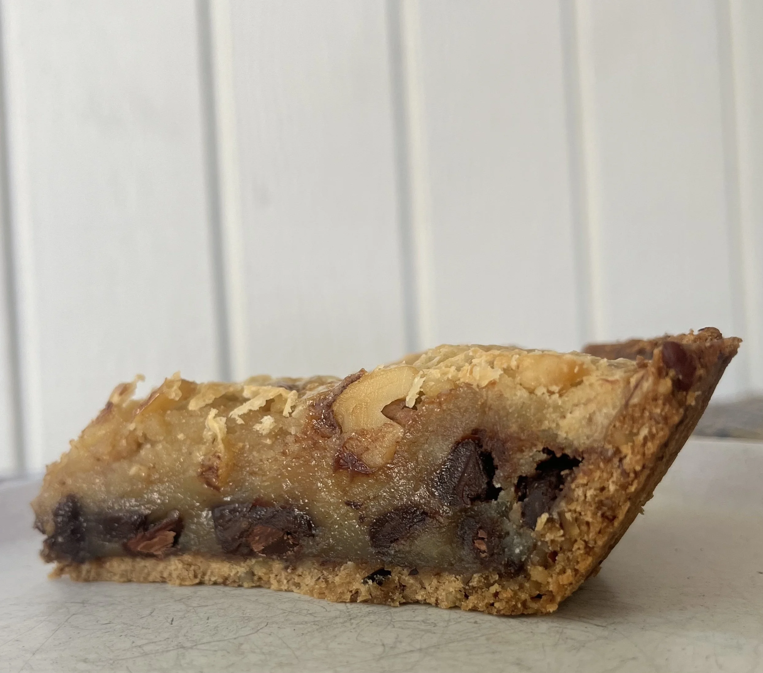 Voila! If you want to actually watch me attempt to eat it, go to the Cookin’ with Congress Instagram or TikTok. Is it beautiful? No. Did it smell good while baking? Very much so. The toasted walnut top layer was aromatic. It seemed to layer evenly, which is…a good thing? I see clear striations: walnut crustiness, creamy margarine, chocolate pieces. Is it supposed to be this clearly defined? I’m not sure; I’ve seen images of derby pie and the chocolate seems to be more evenly distributed than Mitch McConnell’s. Still, it’s not ugly.