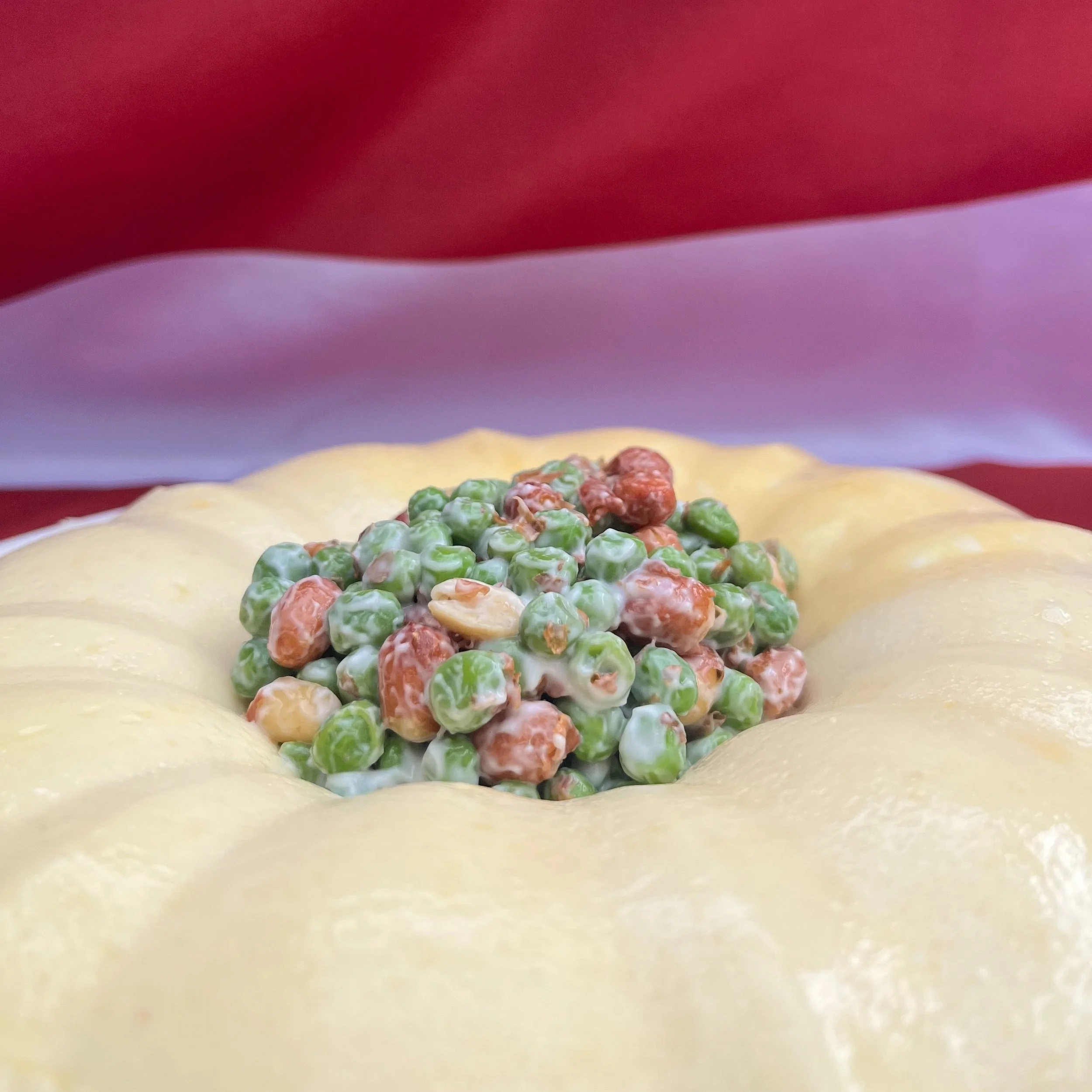Voila! If you want to actually watch me attempt to eat it, go to the CwC Instagram or TikTok. Bring over 11-13 of your closest friends for Peas and Peanut Salad. I have to say, it’s oddly beautiful. The peas and peanuts almost look as though they’ve been frosted, like a pine tree in a miniature winter wonderland. The mold came out perfectly smooth and glistening and is delightfully free of flecks and specks unlike other salads. It does have the scent of straight up mustard though.
