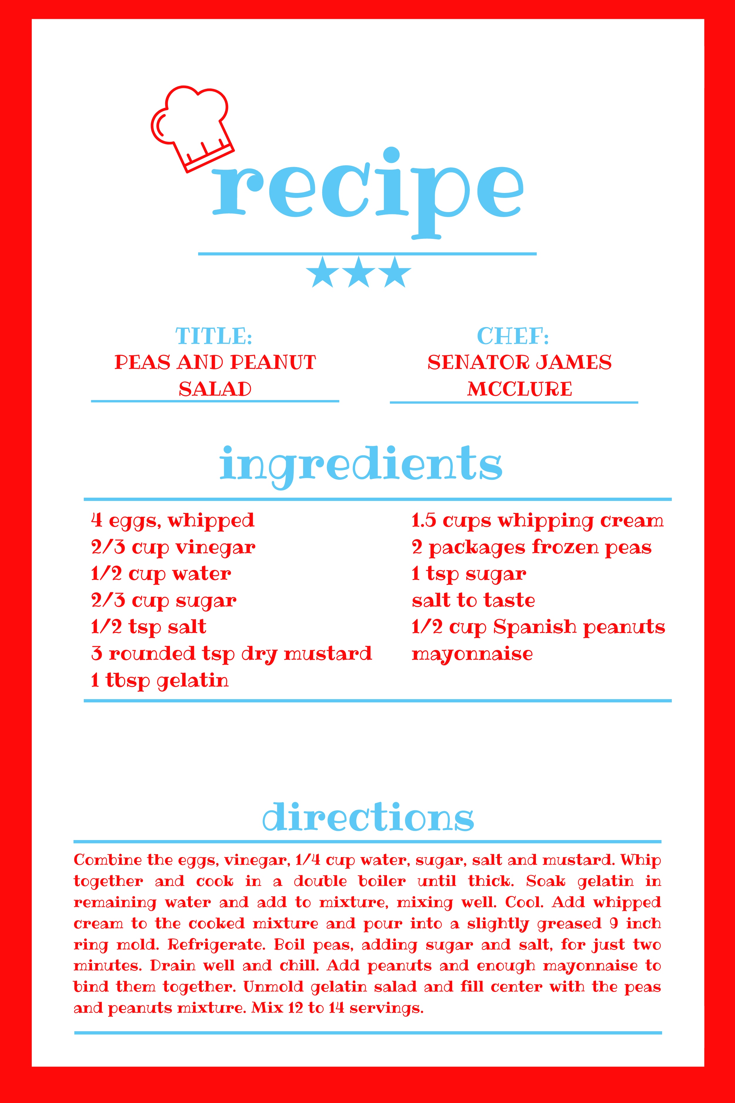 Salad Month (trademarking this very soon, obviously) comes to an end this week, much to everyone’s chagrin. Disappointing, I know, but at least we’ll go out with a bang! And I promise we’ll make every May Salad Month — our household just needs a visual break from such…interesting meals. And this whipped cream & mustard masterpiece is no exception: Senator James McClure’s Peas and Peanut Salad.