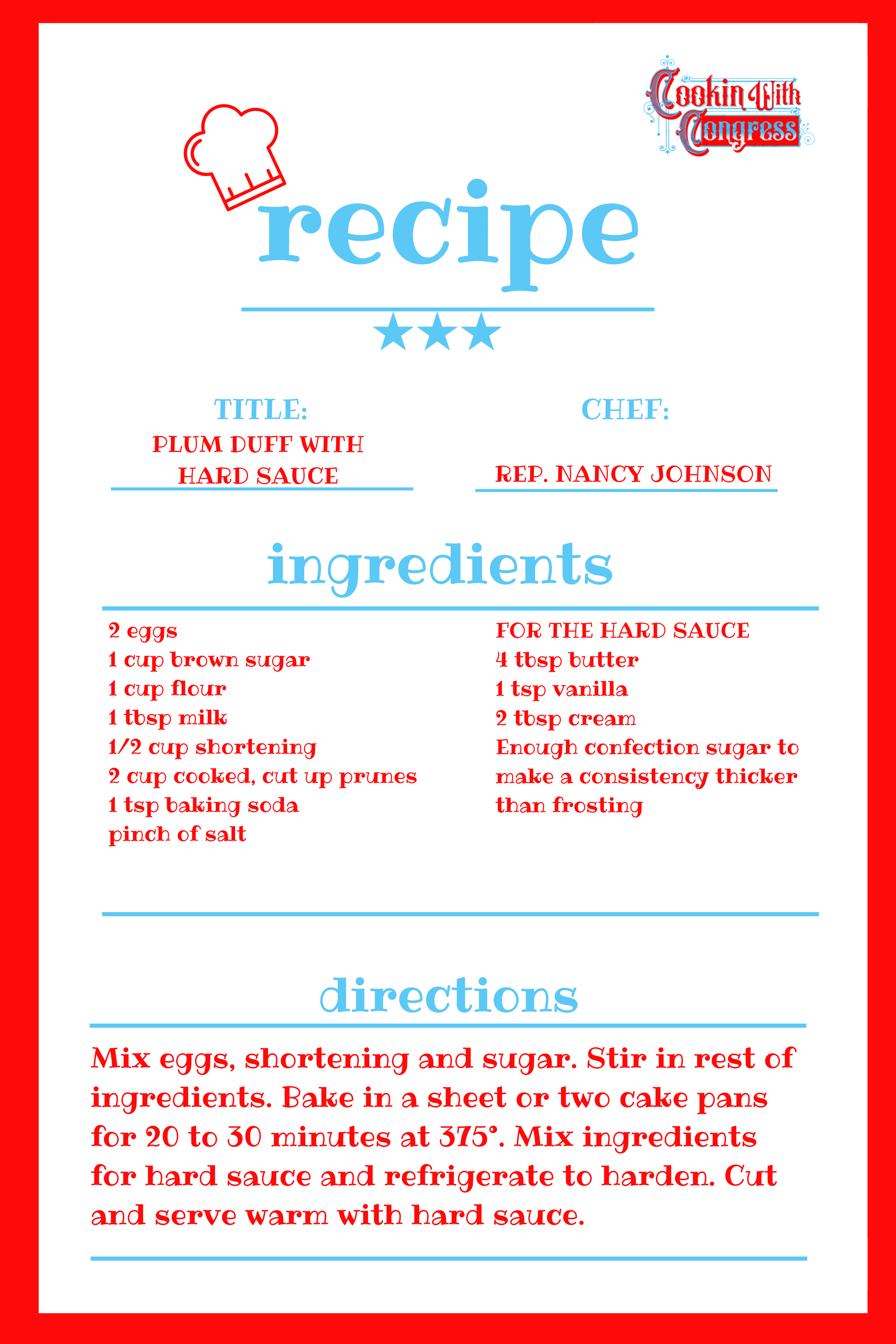 "Plum Duff with Hard Sauce" by Representative Nancy Johnson