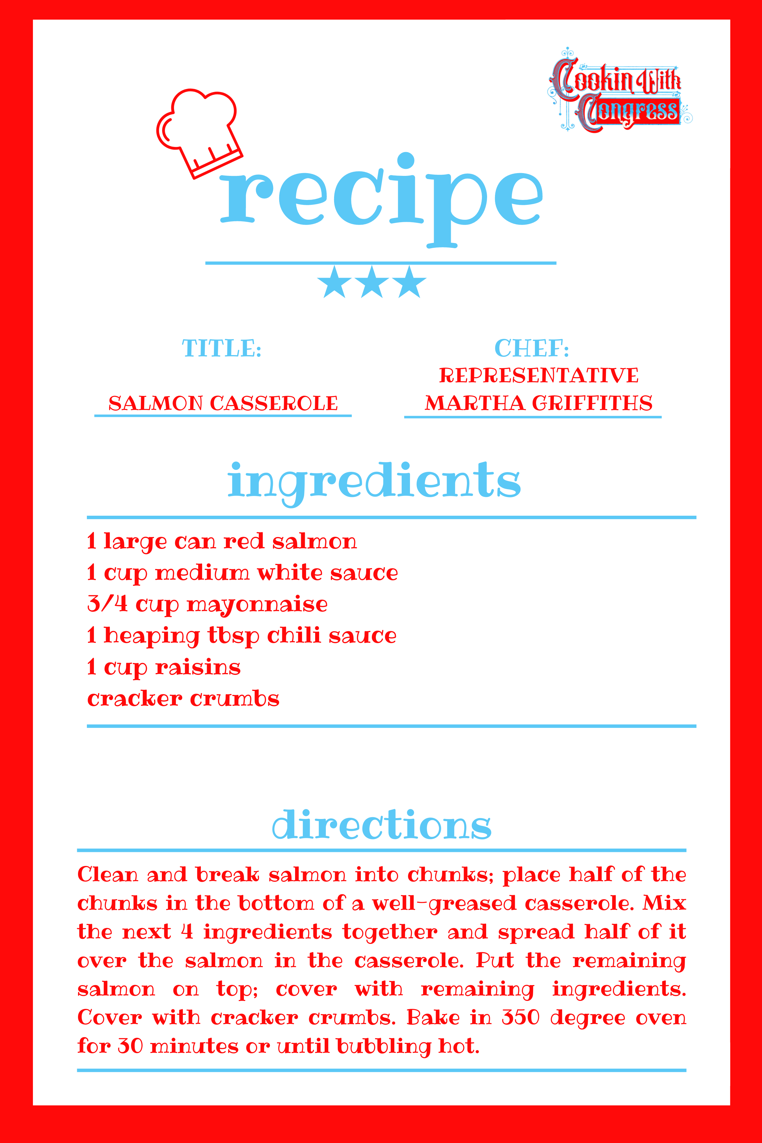 Unlike last week’s recipe from a pro-segregation Florida Democrat, this recipe hails from a person with at least some sense of morality. Representative Griffiths basically resurrected the Equal Rights Amendment and is a big reason why gender discrimination was added to the Civil Rights Amendment. Just as importantly, she put raisins in a salmon casserole.