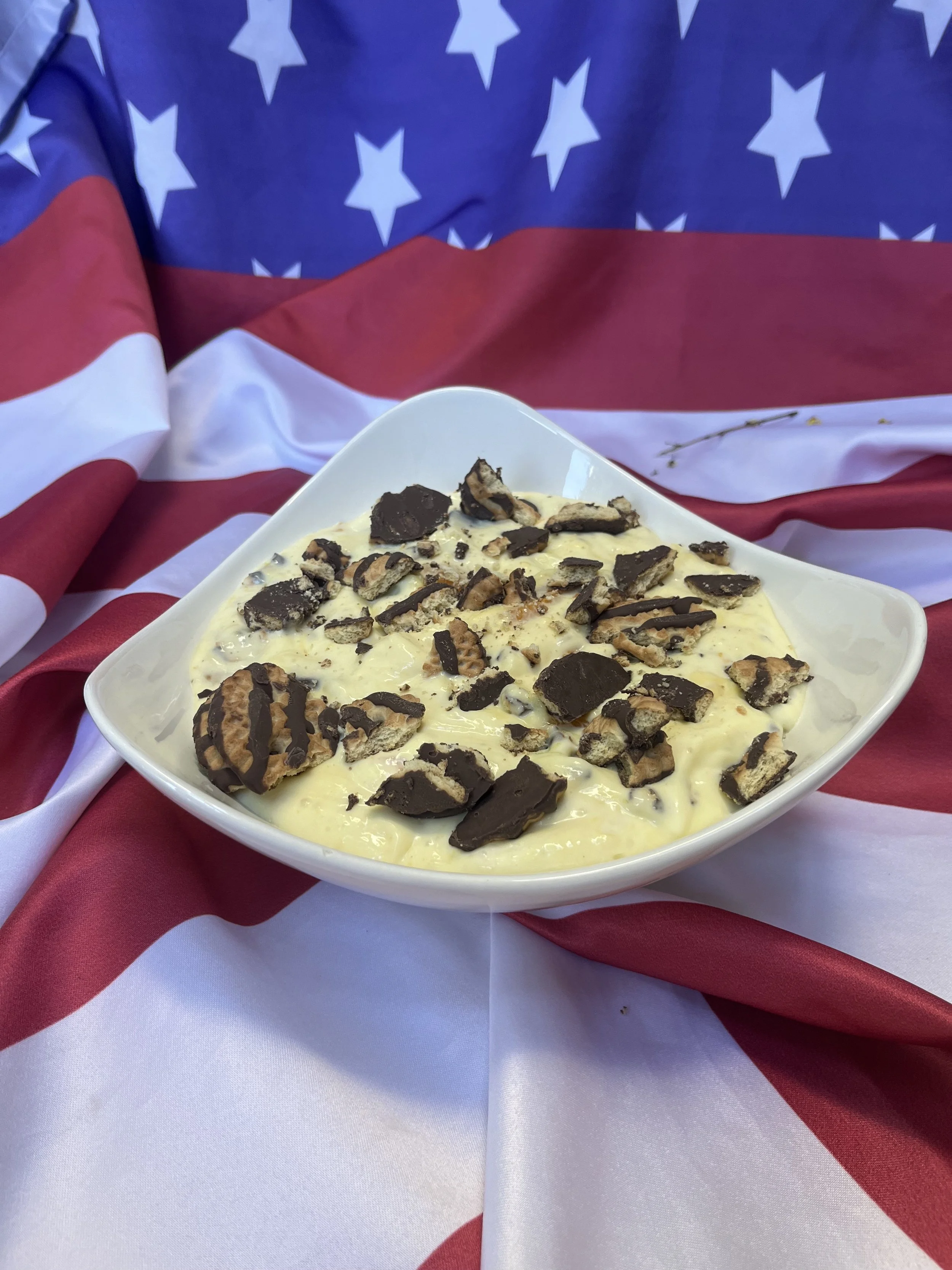 3) Just before serving, crush half-package of fudge stripe cookies and mix in/sprinkle on top.