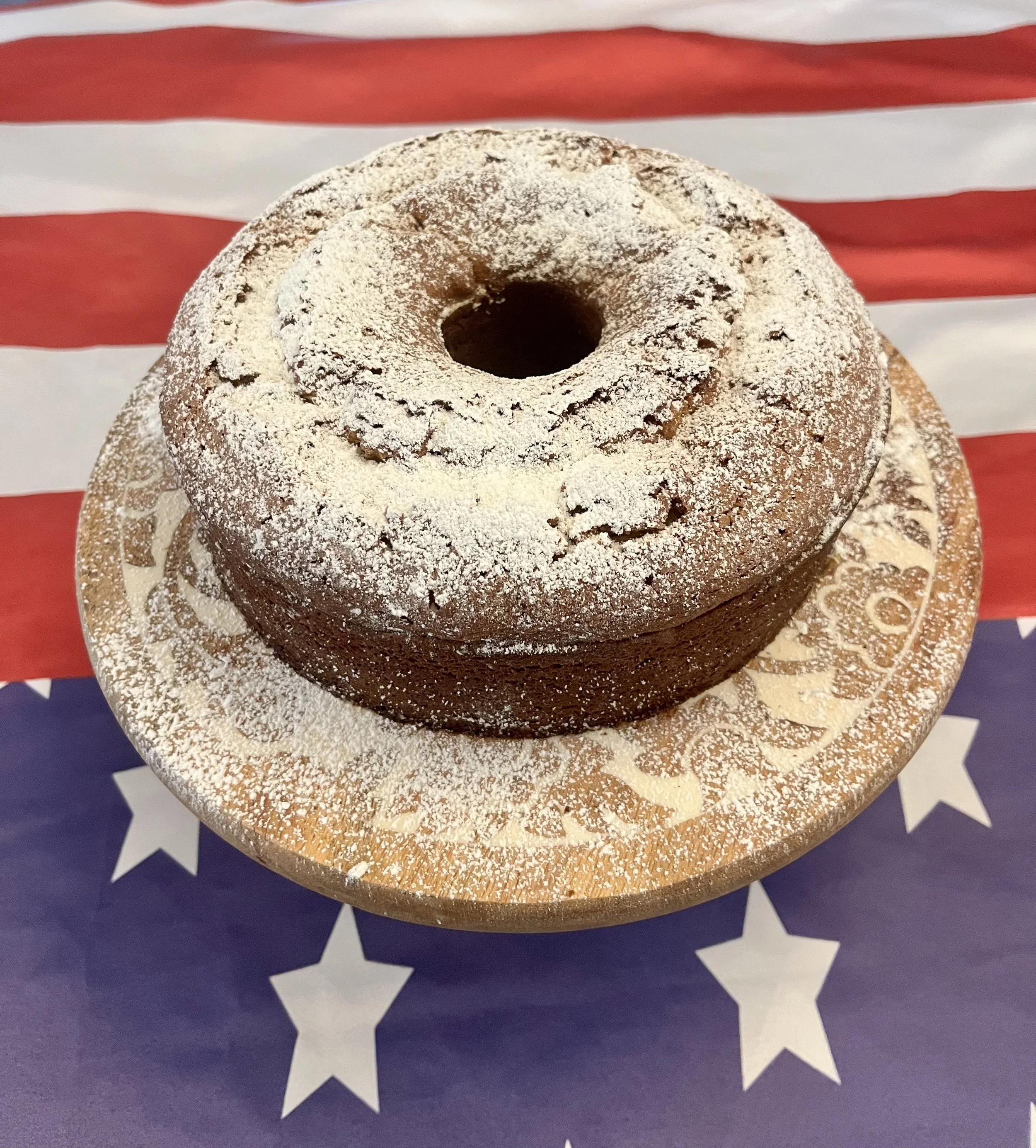5) Remove from pan onto tray sprinkled with confectioners sugar. Sprinkle additional sugar on sides of cake. Serves 10.